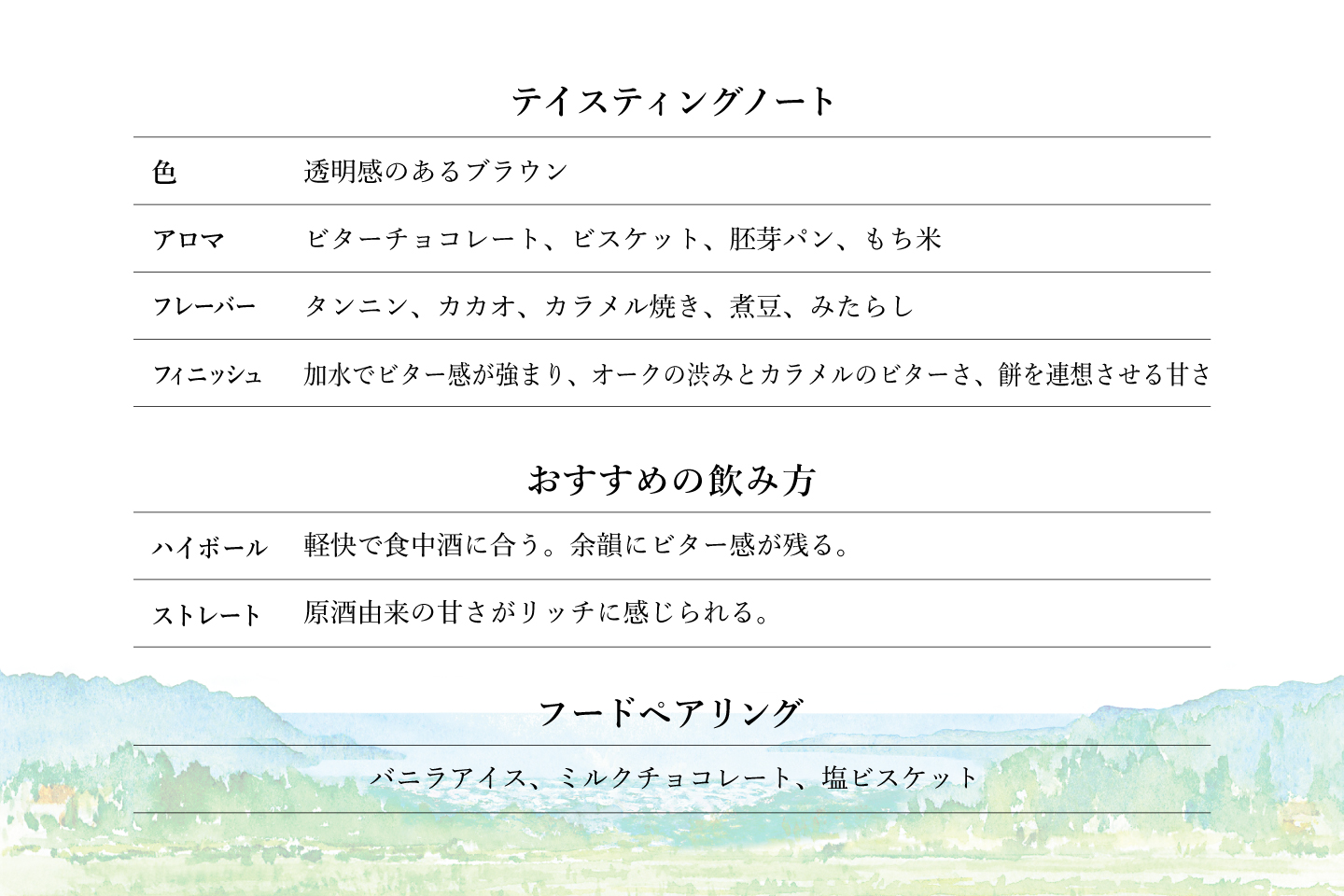 オークの渋みが心地よく続き、カラメルのビターさに、ふと“餅”を思わせるやさしい甘さが寄り添います。