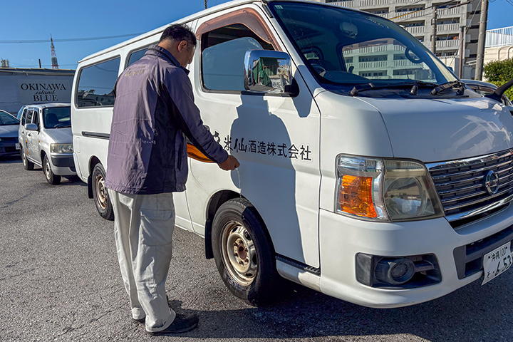 清めのお酒をタイヤにかけて安全祈願を行い、商売繁盛への願いを込めて、初出荷のトラックを社員全員で拍手とともに送り出しました。