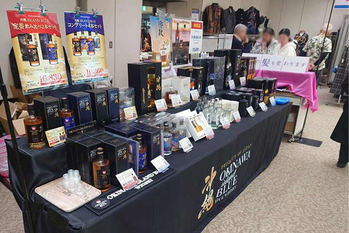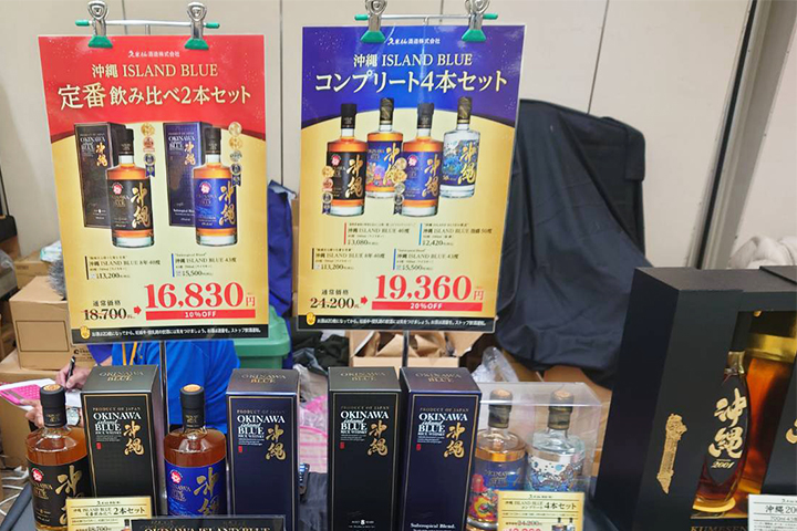 久米仙酒造も出店し、会場では沖縄 ISLAND BLUEシリーズをはじめ泡盛古酒や泡盛珈琲などを販売しています。